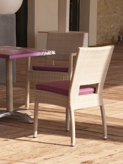 Structure aluminium entièrement tressée – tressage café ou gris soie – coussin d’assise optionnel, revêtement à choisir dans la gamme tissus d’extérieur Ligne Vauzelle